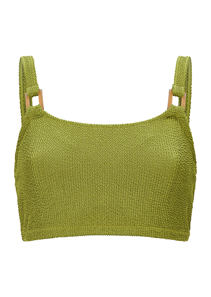 Designed with the 1980's in mind, the Honey high leg bikini brief cuts high on the leg with a Brazilian cut on the back for a cheeky but flattering fit. A textured, shirred fabric in a flattering Moss Green colour. This brief is fully lined.