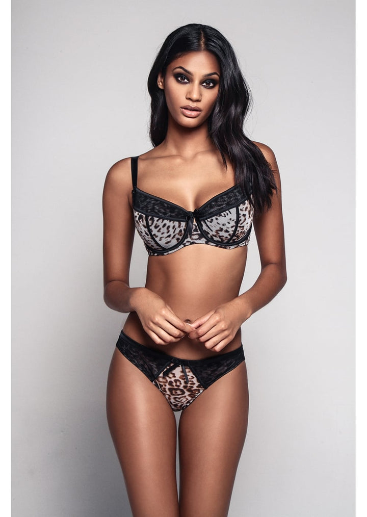 The Kitty thong has a leopard mesh front panel with black mesh sides and a satin waist band.