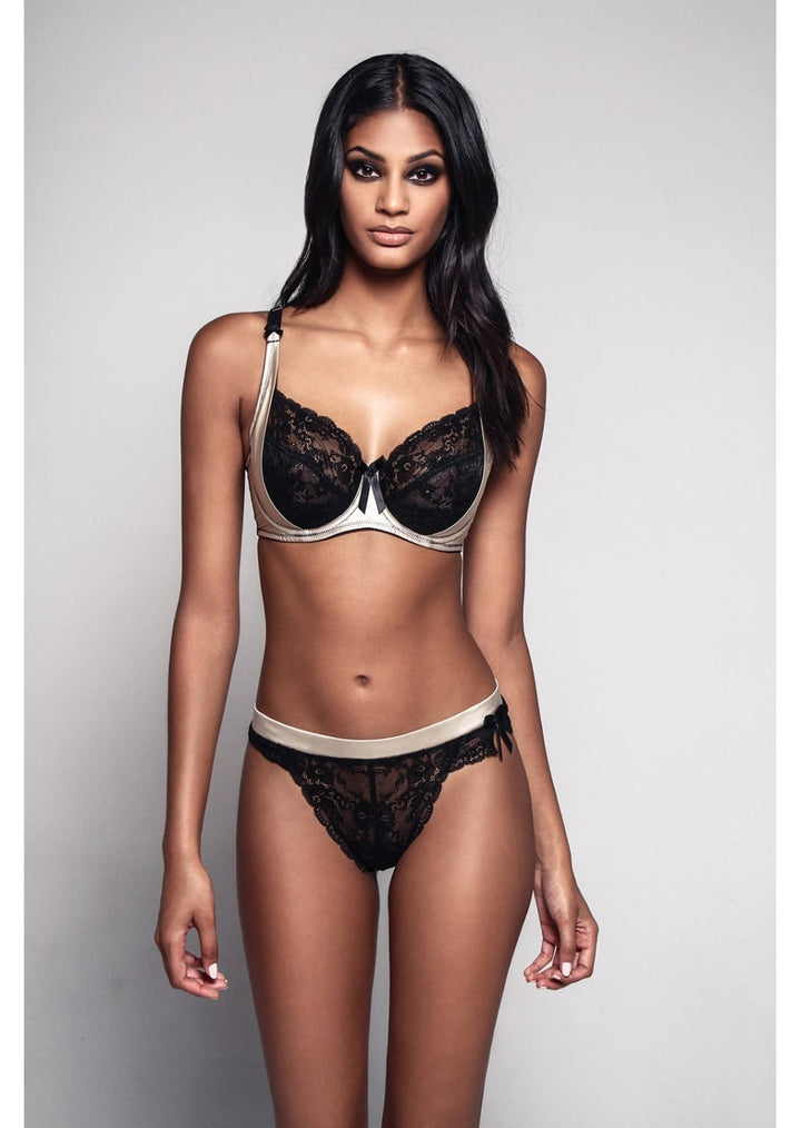 Front stretch black lace suspender with champagne satin side panels and mesh back.