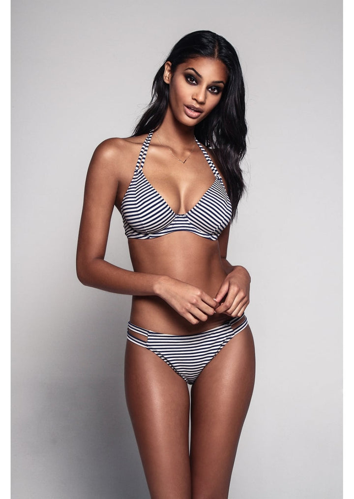 Our Coast halter neck bikini top comes in a navy stripe. The pale stripe has a gold lurex thread running through it giving it a slight metallic shine. The Coast bikini top has a clasp closure to back and is fully lined.